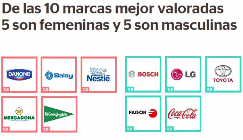 De las 90 marcas analizadas, se sabe que 65 son masculinas, 24 femeninas y una de ellas es una mezcla de ambos géneros. Algunas de las marcas más acusadamente femeninas son Zara, Día, H&M, Mango, Mercadona, Trina y Nestlé; mientras que entre las marcas más masculinas destacan El Mundo, Red Bull, ABC, El País, Repsol, Partido Popular y El Periódico. Llama la atención que las marcas femeninas tengan una apariencia más juvenil. De hecho, el 73% de las marcas femeninas aparentan menos de 40 años; una proporción que baja hasta el 30% en el caso de las marcas masculinas. Ahora bien, de las 10 marcas mejor valoradas, cinco son femeninas (Danone, Balay, Nestlé, Mercadon y El Corte Inglés) y cinco masculinas (Bosh, LG, Toyota, Fagor y Coca Cola). Un dato que también hay que matizar diciendo que la valoración media de todas las marcas femeninas (6,1) es superior a la de las masculinas (5,6).