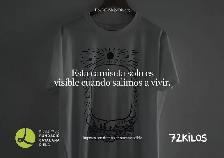 La camiseta ‘Hoy es el mejor día’ es un proyecto creado por un enfermo de ELA y su familia, junto con la Fundación Miquel Valls y el ilustrador 72kilos, para mejorar la calidad de vida de los afectados y afectadas con ELA (Esclerosis Lateral Amiotrófica) y sus familias. Se trata de una camiseta que tiene la peculiaridad de estar impresa con tinta solar termosensible y solo deja ver la frase “Hoy es el mejor día” cuando está en contacto con el sol. “Cuando se sale a vivir. Cuando se celebra que el hoy es el mejor que tenemos”, aseguran los promotores. La camiseta, disponible en castellano y catalán, se puede comprar por internet con un donativo en HoyEsElMejorDia.org