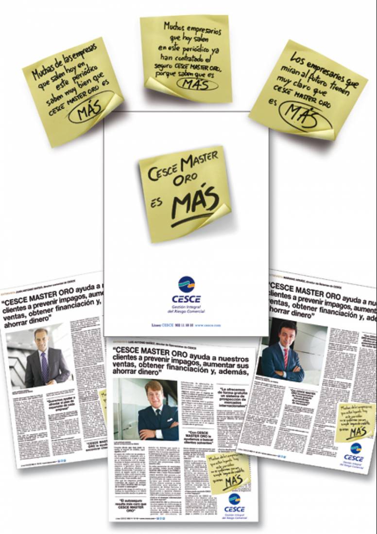 Además, la acción está teniendo un gran alcance al mimetizarse con las páginas de información económica, pues consiste en una llamada en un post-it en la portada complementada con tres entrevistas reales en doble página a color del director de operaciones, director comercial y director de sistemas de Cesce explicando los beneficios del nuevo servicio, en parte tapadas por otro post-it.