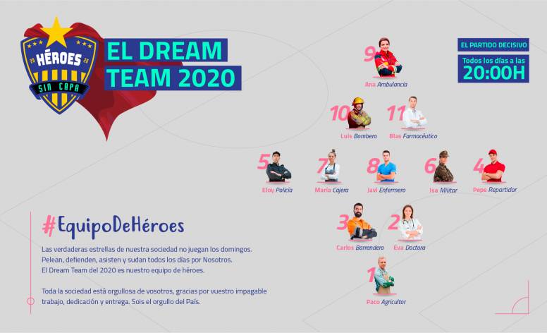 #EquipoDeHéroes refleja la alineación de todos estos grandes desconocidos: agricultores y pescaderos, médicos, barrenderos, repartidores, policías, militares, cajeras y reponedores de supermercados, enfermeros, conductoras de ambulancia, bomberos, farmacéuticos, etc. “Profesionales que pelean, defienden, asisten y sudan todos los días por cuidar de todos”. “Sin lugar a dudas, el dream Team de 2020 es el equipo de estos héroes sin capa”, ha matizado Arribas. De esta forma nace #Eljugador12SomosTodos para facilitar que cualquier persona que lo desee pueda sumarse a esta acción ya que, “como afición, todos merecemos formar parte de este #EquipoDeHéroes”, han dicho desde la empresa. De esta forma la campaña adquiere tintes virales en las redes sociales, gracias a la difusión masiva entre los usuarios, además de las acciones de comunicación concretas que está desarrollando la agencia (comunicación digital, cartelería y publicidad gráfica, acciones de comunicación, etc.).