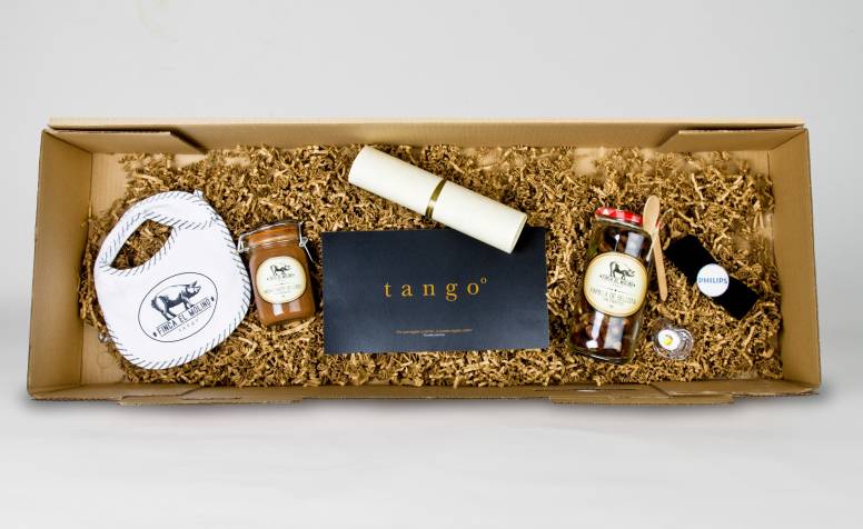 Los clientes de Tango sí que han recibido no obstante una caja jamonera pero, en lugar del consabido pernil, en su interior han encontrado alguno de los componentes clásicos de las canastillas de recién nacidos, pero en formato porcino: crema hidratante de lodo, papilla de bellotas, babero o chupete con forma de bellota, entre otros.