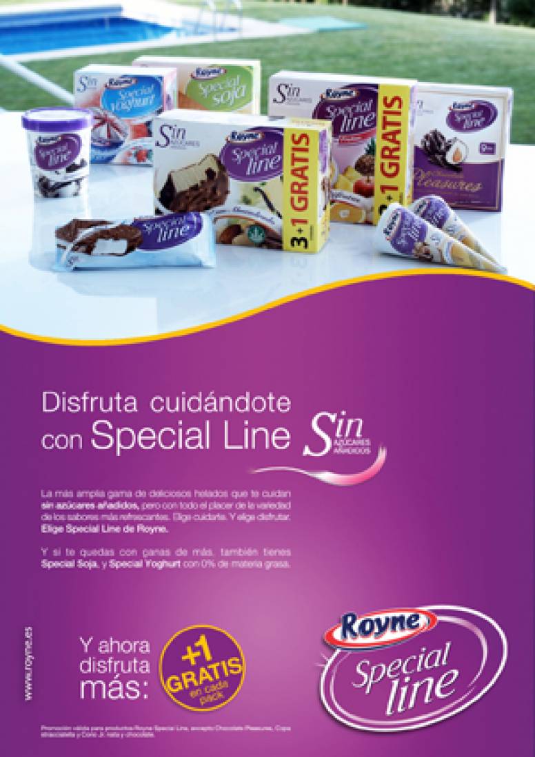 Con el lema “Disfruta cuidándote”, la mallorquina The Atomic Idea hadesarrollado la campaña de imagen de la gama Special Line de Royne con el objetivo de posicionar a la marca como líder en el segmento de “los helados que te cuidan”. La campaña consta de piezas gráficas y de dos spots (20” y 10”) de TV. La campaña utiliza como prescriptoras a las actuales campeonas de la SuperLiga 2009-2010: el equipo femenino del Rayo Vallecano, un equipo líder de mujeres jóvenes y deportistas que encajan con el público objetivo de la marca: mujeres urbanas con un estilo de vida activo y hábitos saludables.