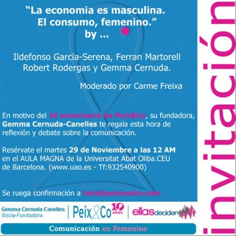 Ildefonso García-Serena, Ferrán Martorell, Robert Rodergas y Gemma Cernuda participarán en la mesa redonda "La economía es masculina. El consumo, femenino", organizada con motiivo del décimo aniversario de la agencia de comunicación en femenino Peix&Co. Será el próximo martes, 29 de noviembre en la Universidad Universidad Abat Oliba de Barcelona, a las 12.00 horas.