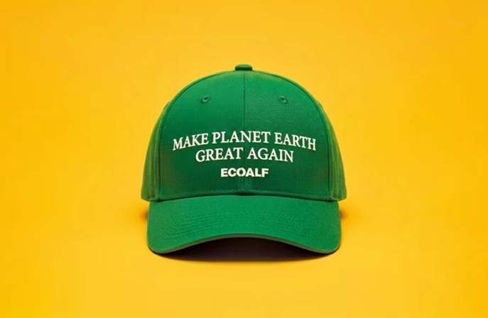 La gorra de Ecoalf, sobre un color verde primavera, reza el lema "Make Planet Earth Great Again" y es a todas luces una llamada social con al que pretende poner de relieve que la sostenibilidad no es una tendencia pasajera y que forma parte de responsabilidad colectiva que tiene el género humano hacia las generaciones futuras.