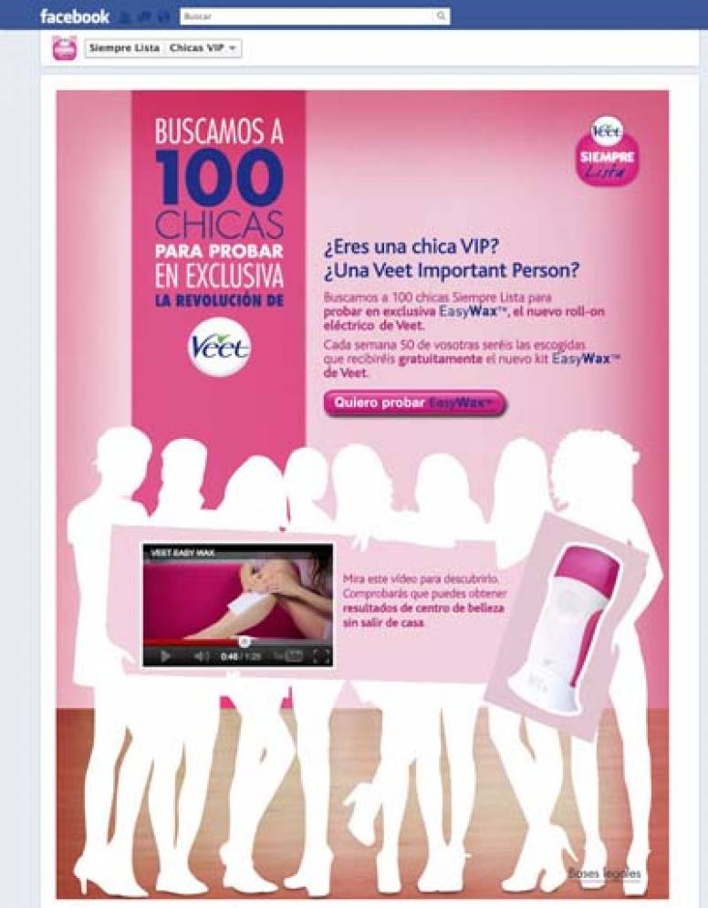 La segunda acción en Facebook está orientada al engagement de sus fans y a la interacción de las consumidoras con sus productos. La marca busca a sus 100 mejores fans para que prueben en exclusiva su nuevo y revolucionario lanzamiento, el nuevo roll-on de cera EasyWax, que permite depilarte en casa con los mismos resultados que en un centro de belleza. Bajo el título "¿Eres una chica VIP? ¿Una Veet Important Person?" esta acción permite que sus usuarias se conviertan en auténticas portavoces del producto y embajadoras de la marca, y acaba de aparecer en la página de Facebook de la marca www.facebook.com/siemprelista.