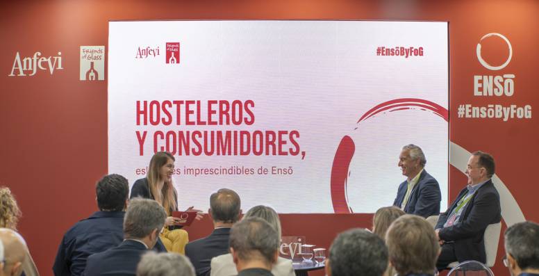 En la imagen de portada aparecen, de izquierda a derecha: Karen Davies, secretaria general de ANFEVI; José Manuel Núñez Lagos, director general de Ecovidrio; y José Luis Yzuel, presidente de Hostelería de España