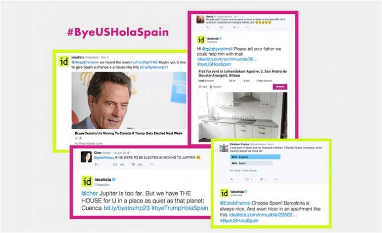 Para ello se ha contestado desde el perfil de la marca a diferentes usuarios y famosos como Cher, Amy Schumer y Bryan Cranston que han explicado en Twitter que abandonarían Estados Unidos si Trump ganara. Todos sus mensajes han sido respondidos con ofertas de viviendas en venta y alquiler de toda España acompañadas de un nuevo hashtag: #ByeUSHolaSpain.