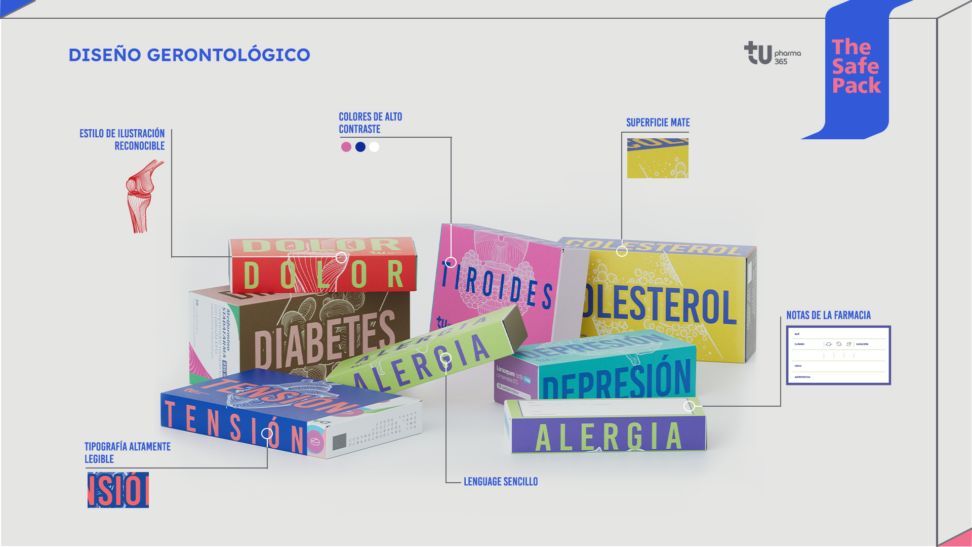 Para tratar de solucionar este problema real, la empresa TuPharma365 ha lanzado "The Safe Pack", un nuevo sistema de diseño que proporciona fajines adaptables a cualquier caja de medicamentos para facilitar su identificación y evitar errores mediante los principios del diseño gerontológico. Todo bajo un concepto claro: "Los medicamentos solo deberían salvar vidas, no ponerlas en riesgo".