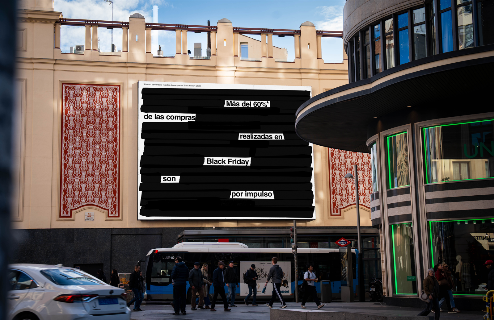 La entidad digital transforma algunos de los espacios publicitarios más icónicos de Madrid en zonas de “silencio visual” para invitar a la reflexión sobre los hábitos de compra en uno de los momentos de mayor presión comercial del año