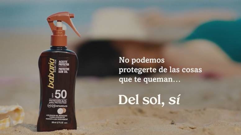 Bajo el concepto creativo “No podemos protegerte de todo lo que te quemará este verano… Del sol, sí”, la campaña solar de Babaria mezcla un tono fresco y directo con el sentido del humor a fin de concienciar a los consumidores sobre la necesidad de tomar el sol con protección y evitar así los peligros derivados de la incidencia directa de la radiación solar en la epidermis.