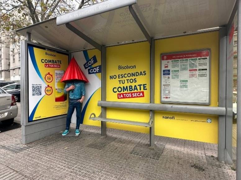 La activación cuenta con el vinilado integral de autobuses en Madrid y Barcelona, en el que se traslada el mensaje de la marca de manera llamativa. Se complementa con el vinilado integral de varias marquesinas, en alguna de ellas los usuarios de transporte y viandantes encontrarán un corpóreo 3D, a tamaño real, de una persona “escondiendo” su tos bajo un paraguas. Un divertido guiño con el que todos nos hemos sentido identificados.
