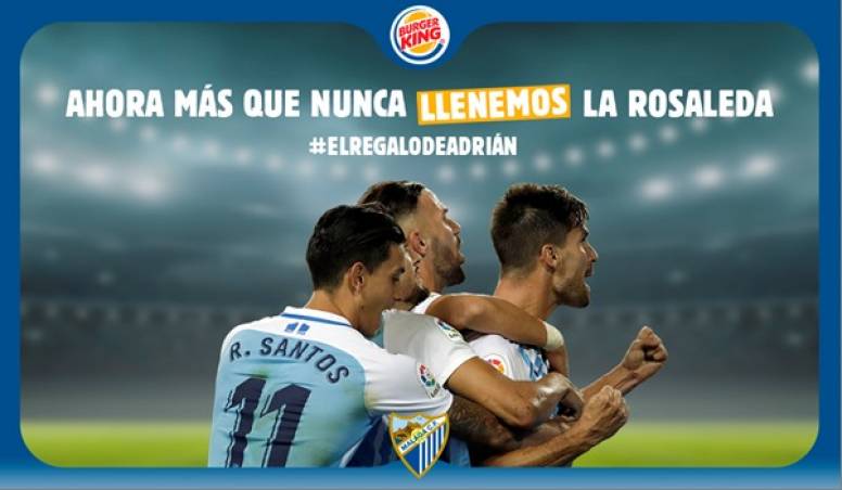 El deseo de Adrián se ha inmortalizado en un vídeo que se ha hecho viral en estos días. Así que el Rey de Burger King se ha puesto manos a la obra para cumplir el deseo del joven malagueño en particular, y el de todos los aficionados al fútbol en general. Para ello ha lanzado la campaña #elregalodeadrián, con una promoción exclusiva en Málaga capital en la que ofrece 4 Menús a elegir + Complemento + Entrada por solo 9,95 euros para motivar a la afición malaguista y que se vuelva a llenar La Rosaleda en un momento clave para el conjunto costasoleño, que ocupa una posición cercana a las últimas posiciones en la tabla de clasificación de la segunda división española y que se encuentra en medio de un complicado conflicto económico y accionarial que podría determinarse en los tribunales en los próximos meses, lo que condiciona la viabilidad del proyeto deportivo.