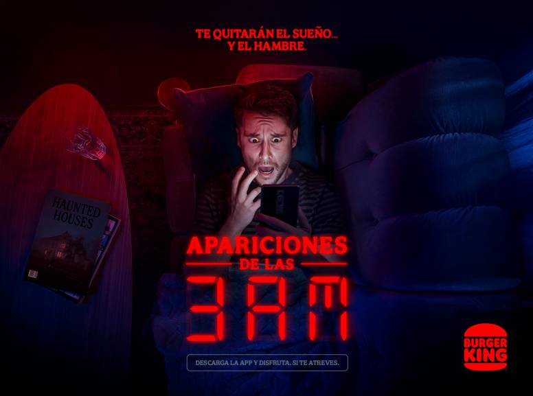 Ideada por la agencia DAVID Madrid, la campaña cuenta con una pieza para televisión de 20 segundos y otra para digital de 40. En ellas, la tensión y los sonidos escalofriantes acompañan escenas en las que se producen fenómenos paranormales a las tres de la madrugada en diferentes hogares. Unas apariciones que no sólo quitarán el sueño a quien las vea sino también el hambre, gracias a los menús gratis que la marca ofrecerá en su aplicación, durante toda la semana de Halloween. Pero, como es bien sabido, en la noche de Halloween, las apariciones sobrenaturales se apoderan de nuestras calles y los monstruos alteran nuestra plácida noche de sueño y, por eso, hacerse con los menús gratis de Burger King, tendrá un “precio escalofriante”.