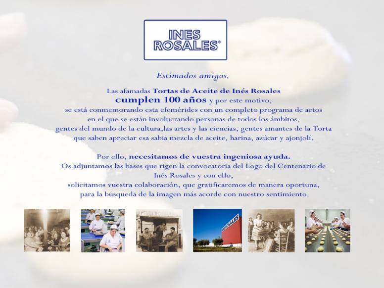 La firma Inés Rosales ha convocado un concurso abierto de participación para elegir el nuevo logotipo del centenario de la marca, el cual se utilizará en todas las acciones que se lleven a cabo durante el año, tales como actuaciones de publicidad, cartelería o comunicación. Cualquier persona física o jurídica que presente su propuesta antes del 9 de abril puede presentarse al concurso, que se resolverá el día 15 de ese mes.