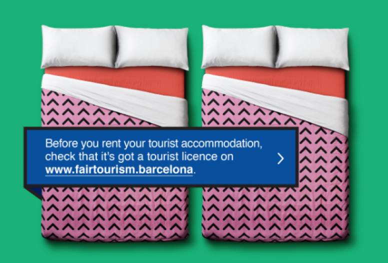 Para ello, de la mano de la agencia Doubleyou, se lanzó el mensaje “Que esté en Internet no significa que sea legal”, así como un key tan visual y universal como es una cama. En cocnreto se colocó una cama en tres de los puntos más céntricos y transitados de la ciudad: la Sagrada Familia, la Catedral de Barcelona y la playa de la Barceloneta. Unas instalaciones en las que los usuarios podían informarse acerca de la situación y colaborar con la denuncia del Ajuntament utilizando el hashtag #fairtourismBCN. Asimismo y hasta principios de octubre, la cama estará colocada en la T1 del Aeropuerto de Barcelona, para concienciar y dar la bienvenida a quienes llegan a la ciudad.