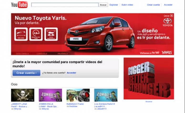 Toyota se ha convertido hoy en el primer anunciante en España en desarrollar una campaña de publicidad "Takeover" en YouTube. La campaña se pone en marcha con motivo del lanzamiento del nuevo Toyota Yaris.