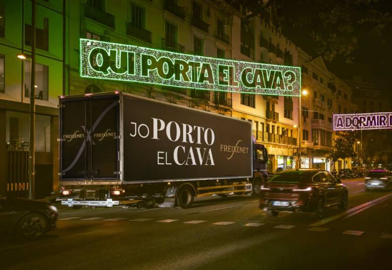 Freixenet ha reaccionado al mensaje navideño que iluminó la calle Aragó -‘Qui porta el cava?’- con una acción de street marketing que traslada la conversación al espacio físico. La marca respondió desde el mismo lugar donde nació el fenómeno, haciendo circular por la ciudad un camión de nueve metros con un mensaje tan directo como cómplice: ‘Jo porto el cava’, convirtiendo la iluminación urbana en un intercambio en tiempo real con los ciudadanos.