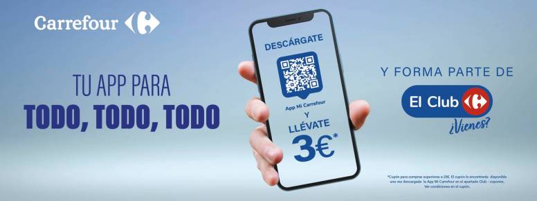 La App Mi Carrefour incluye todas las ventajas de El Club Carrefour, y ofrece un cupón descuento de 3€ para los nuevos usuarios de la App -con una compra superior a 25€- tanto para promover su uso entre los miembros de El Club Carrefour, como para dar entrada a nuevos usuarios que se beneficiarán de las ventajas de la App y de El Club Carrefour.