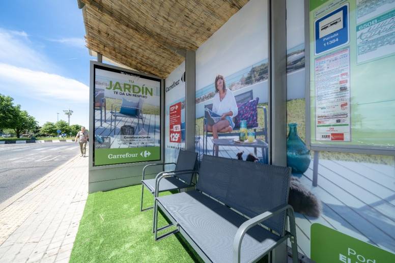 La acción, llevada a cabo durante una semana del 9 al 15 de mayo, ha consistido en vinilar por completo las marquesinas con la creatividad y la promoción de la campaña “Tu jardín te da un respiro” y en sustituir el mobiliario de las paradas de autobús por el conjunto de terraza o jardín Antalya, de venta en Carrefour, que se ha colocado sobre césped artificial y bajo un techado de bambú para hacerlo más acogedor.