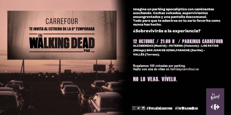 La noche del próximo 12 de octubre Carrefour convertirá el parking de cinco de sus establecimientos en un escenario apocalíptico para que los jóvenes españoles vivan el estreno de la sexta temporada de la serie 'The walking Dead', una de las más exitosas en España y a nivel mundial, batiendo records de audiencia temporada tras temporada, recuperando el formato autocine.