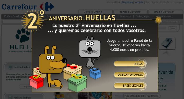El programa de fidelización 'Huellas', creado por la firma Carrefour y diriod a los dueños de mascotas, quiere agradecer la fidelidad e sus componentes por su segundo aniversario. Para ello premiarán a los usuarios registrados que participen en un adevergaming con 4.000 euros en premios directos y cientos de cupones descuento de las principales marcas de alimentación para mascotas.