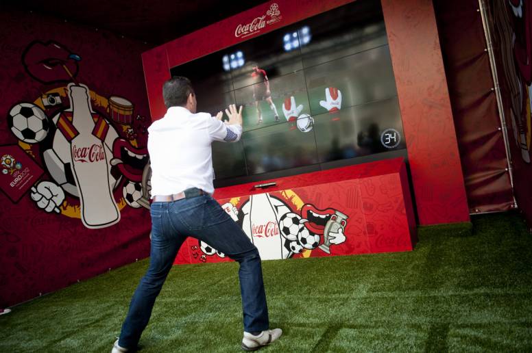 La marca Coca-Cola ha querido anticiparse al inicio de la UEFA Euro 2012 con una acción especial que tiene por objetivo lanzar el fútbol a la calle y vincular los valores de este deporte a la marca. La acción, que se enmarca dentro de la estrategia de comunicación y patrocinio que la marca desarrolla gracias a su papael de sponsor oficial en la Eurocopa de Polonia, se basa en un juego virtual que ha convertido el centro de Madrid en un peculiar estadio de fútbol. Gracias a este juego, y con la asesoría de los ex porteros Francisco Buyo y Carlos Fernando Navarro Montoya, los aficionados han podido enfundarse los guantes y convertirse en porteros para calentar motores de cara a la cita deportiva que comienza el próximo 8 de junio.