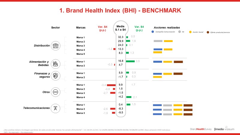 Según los resultados obtenidos, tras cuatro semanas desde la declaración del estado de alarma, las marcas de Retail consolidan su reputación con subidas continuas de imagen en su BHI. Estas obtienen un Brand Health Index medio -individuos que declaran que su imagen ha mejorado últimamente menos los que declaran que ha empeorado- del 21,6% en la cuarta semana de confinamiento.