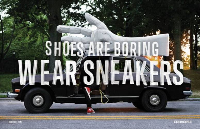 La marca Converse ha puesto en marcha en mercados estratégicos (de momento Norteamérica y Reino Unido) una nueva campaña de comunicación en medios gráficos y televisión donde invita a los consumidores a dejar de lado la versión 'seria' de la vida, identificada con los zapatos, y abrazar la vertiente más vital y estimulante, reflejada en los sneakers (zapatillas en inglés). "Los zapatos son aburridos. Usa zapatillas" es el claim final con el que se resume la campaña, ideada por la agencia Anomaly, que emplea un tono superficial y humorístico para lanzar el mensaje.
