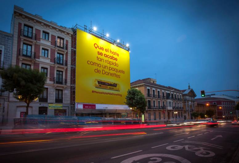 La nueva campaña de Donettes rebaja el odio y reivindica la amistad heterogénea y el buen rollo, a través de una acción en exterior que lucirá el lema “Menos Hate, más Donetting”, en el barrio de Malasaña, en Madrid, desde el 18 de mayo hasta el 15 de junio.