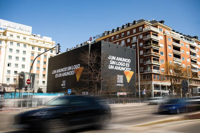 El triángulo de Doritos es tan icónico que no necesita presentación. Este axioma es el origen de la nueva campaña de la marca de Pepsico en Madrid: una lona de 14 metros de altura en la plaza Colón en la que se distingue un triángulo gigante. Esta forma geométrica es tan representativa de Doritos que la marca parte del ‘product centric’ y prescinde de sus assets oficiales.
