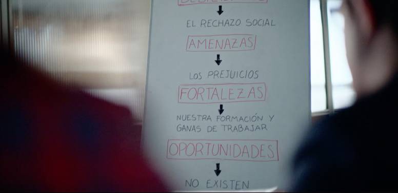 La pieza principal presenta un día cualquiera en la ‘Extraconsultoría’, una consultora única en la que trabajan personas con síndrome de Down asesorando a personas que no encuentran trabajo. Como explica María, la CEO de esta peculiar empresa, “las personas con síndrome de Down son más expertas que nadie en el rechazo laboral”. Así que quién mejor que ellos para asesorar al resto de la sociedad sobre el tema.