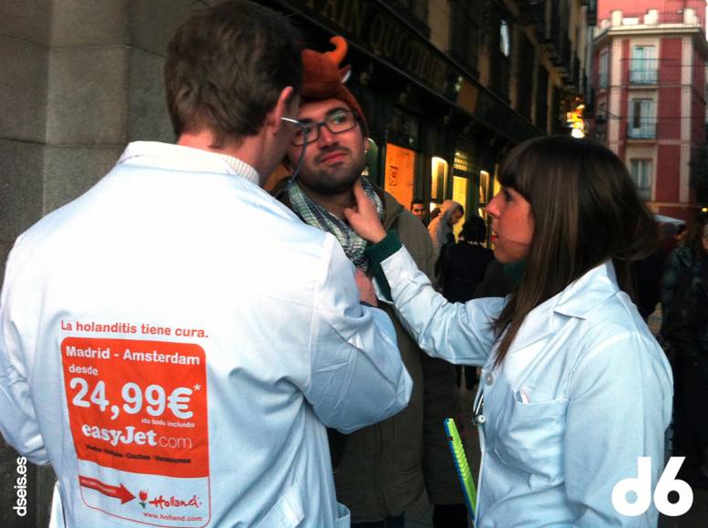 De la mano de la agencia D6, Easyjet y la Oficina de Turismo & Congresos de Holanda han lanzado una campaña promocional para volar a Amsterdam con los precios más bajos. Según la agencia, en España hay un virus que se manifiesta en una creciente pasión por la tierra de los tulipanes y para ponerle freno, easyjet y la Oficina de Turismo & Congresos de Holanda mandaron a un equipo de médicos a recorrer este fin de semana el centro de Madrid. Así, tres comandos de médicos han realizado las pruebas pertinentes para confirmar el grado de holanditis de los transeúntes: radiografías en las que se podía ver un zueco holandés situado en el corazón, auscultaciones, pruebas de reflejos o toma de temperatura para diagnosticar la 'holanditis', un efecto positivo que provoca en el cuerpo y en el alma visitar Holanda. Tras el diagnóstico, los médicos recetaban 'ir corriendo al aeropuerto y coger el primer vuelo a Amsterdam desde 24,99 para saciar su holanditis' o bien, 'más naranja'. Para que siguieran la receta al pie de la letra, los médicos entregaban a todos un termómetro en el que venía la oferta del vuelo.