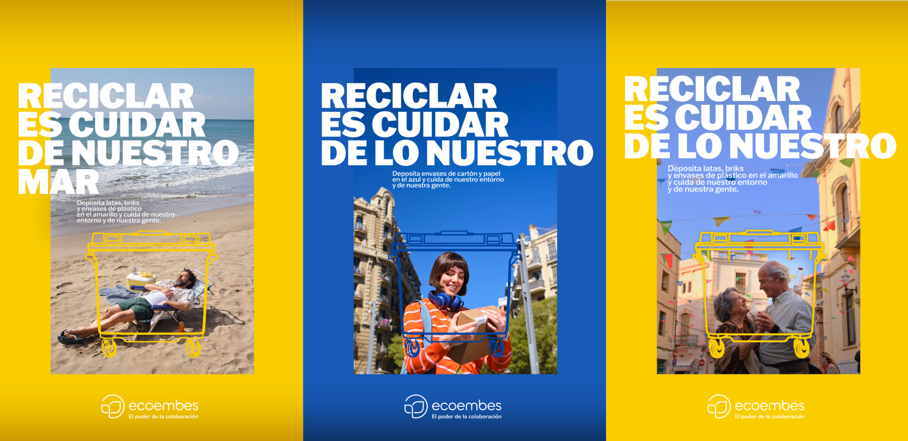 En paralelo, la campaña gráfica traslada el concepto audiovisual a soportes estáticos mediante escenas cotidianas enmarcadas por las siluetas de los contenedores, reforzando visualmente la idea de que reciclar contribuye a proteger aquello que forma parte del entorno compartido.