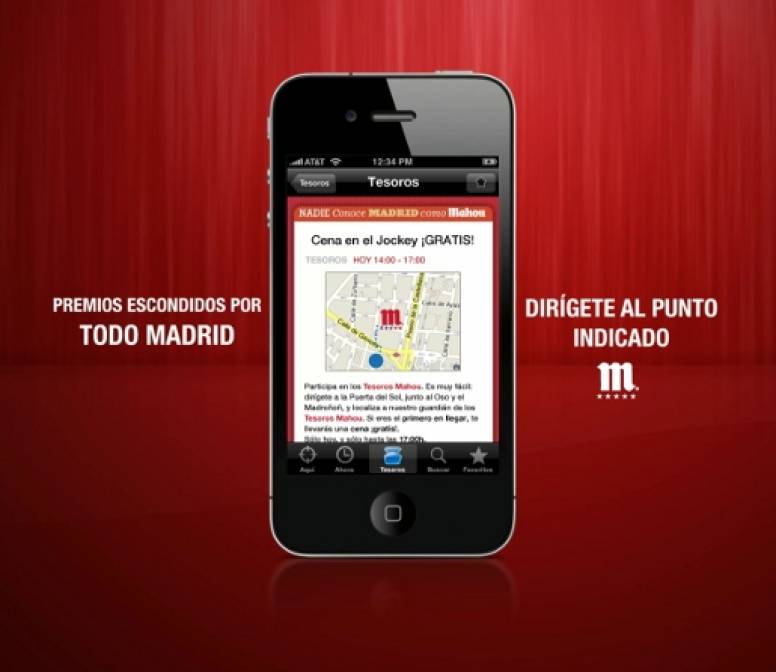 El próximo fin de semana la firma Mahou pone en marcha “Tesoros Mahou”, una iniciativa en torno a su aplicación para iPhone “Madrid Mola”, en la que la cervecera esconderá regalos a lo largo y ancho de la capital de España. Ideada por la agencia Mobile Dreams Factory, la aplicación permite a los usuarios disfrutar de la ciudad partiendo del concepto creativo “Nadie conoce Madrid como Mahou”. Esta plataforma virtual permite conocer los bares, restaurantes y tiendas de la zona en la que esté el usuario. Igualmente ofrece datos de conciertos, exposiciones y eventos culturales que tengan lugar en la localidad.