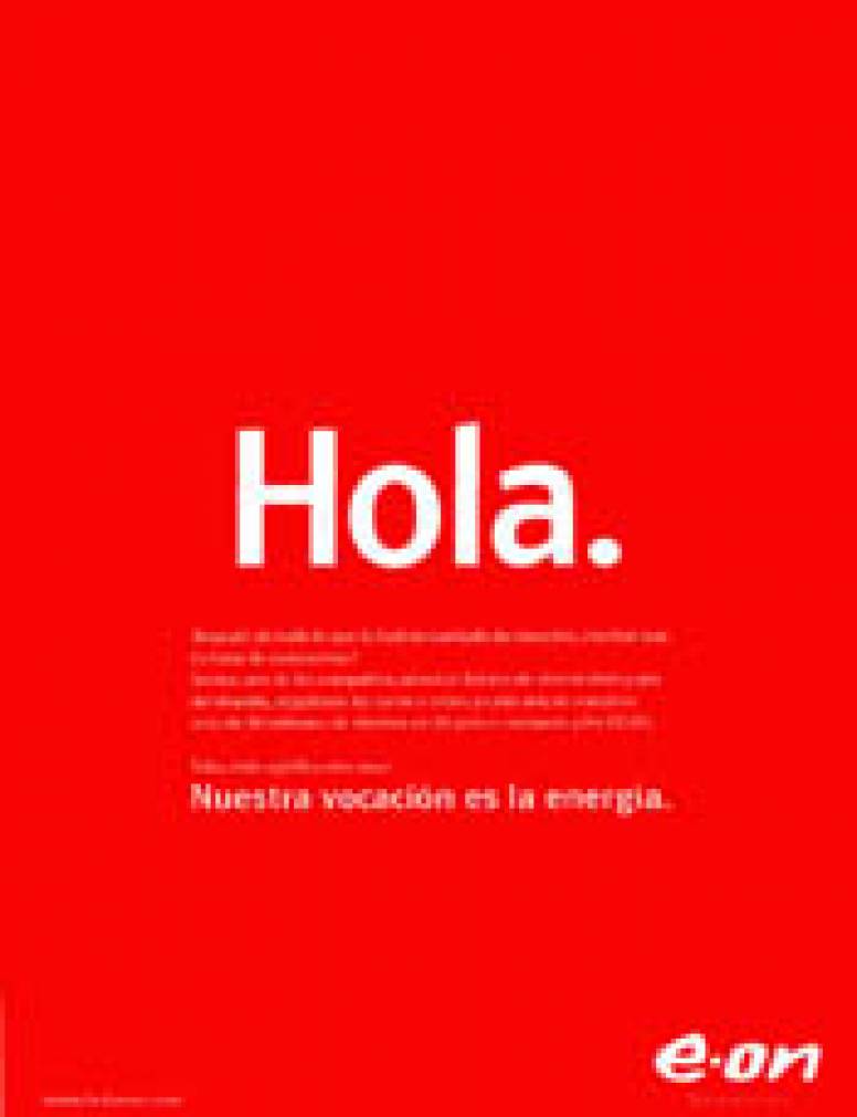 Los accionistas de Endesa y los consumidores españoles son el target de una campaña que invita al lector a interesarse por E.On: “Hola. Después de todo lo que le habrán contado de nosotros, ¿de verdad es hora de conocernos? Somos una de las compañías privadas líderes de electricidad y gas del mundo, orgullosos de servir a todos y cada uno de nuestros más de 30 millones de clientes en 20 países europeos y los EE.UU. Esto, sólo significa una cosa: nuestra vocación es la energía”.