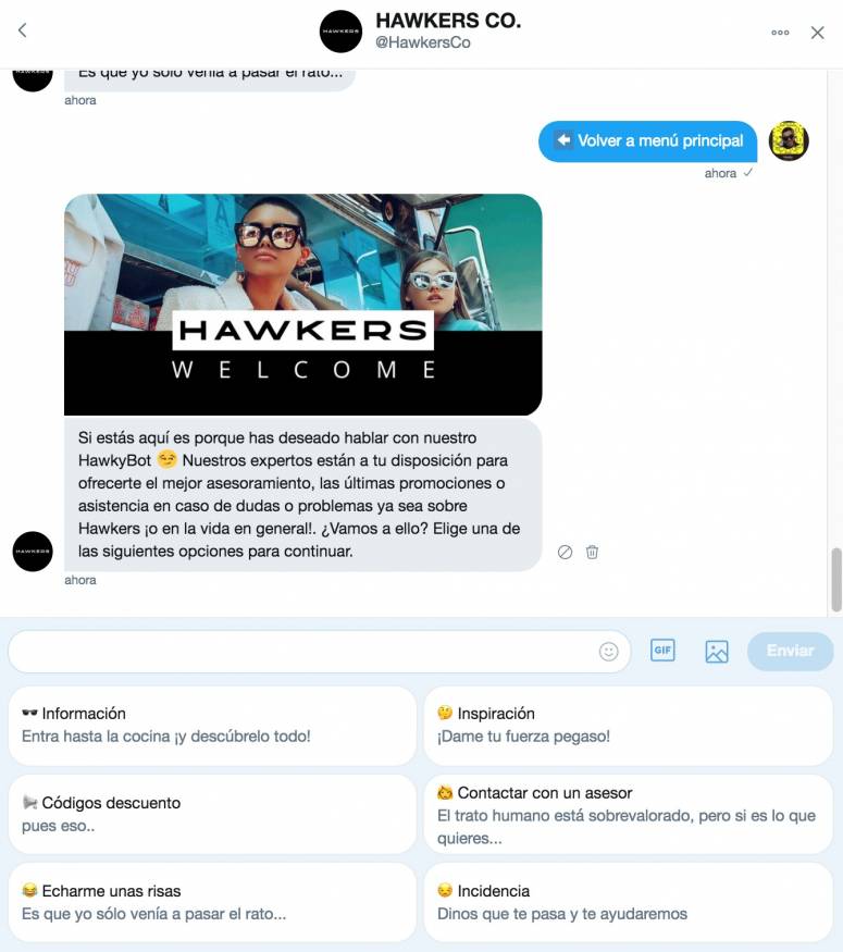 Hawkers, la empresa española de referencia a nivel global en el mundo de las gafas y los complmentos,, ha puesto en mcraha su nuevo asistente virtual a través de mensaje directo en la red social Twitter. Una innovación desde el punto de vista de gestión de usuario y el marketing que permitirá a los consumidores y clientes reportar a la empresa alicantina incidencias, solicitar información, buscar el modelo que más se ajuste a sus gustos e incluso llegar hasta la compra. Con esta operación Hawkers se convierte en la primera compañía española en ofrecer un proceso de venta prácticamente completo en la plataforma, y la primera del mundo en el sector de moda y accesorios, según declaran sus propios respomsables.