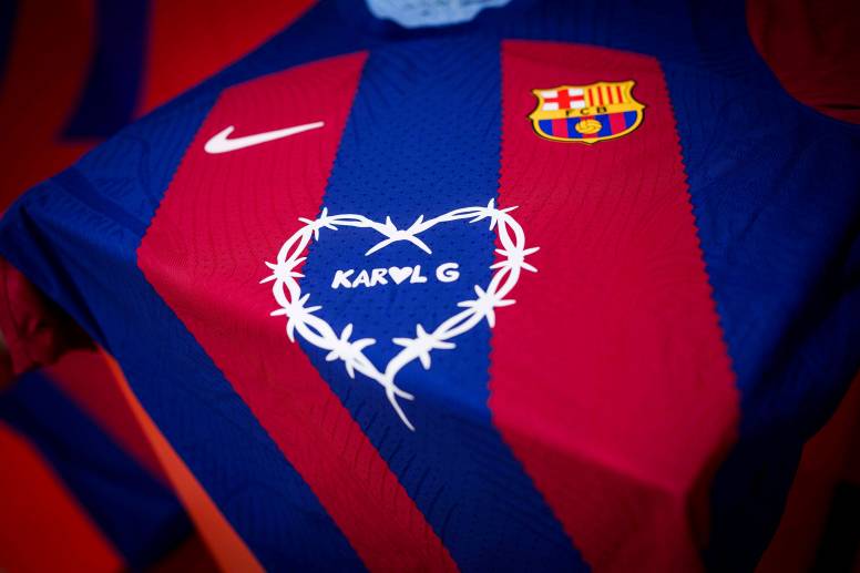 El corazón de Karol G ha sido el protagonista de las equipaciones del equipo culé en el partido de la Liga F del FC Barcelona contra el Villareal Femenino jugado este sábado. Además, esta camiseta también la llevará el equipo masculino el próximo 21 de abril, cuando se enfrente al Real Madrid.