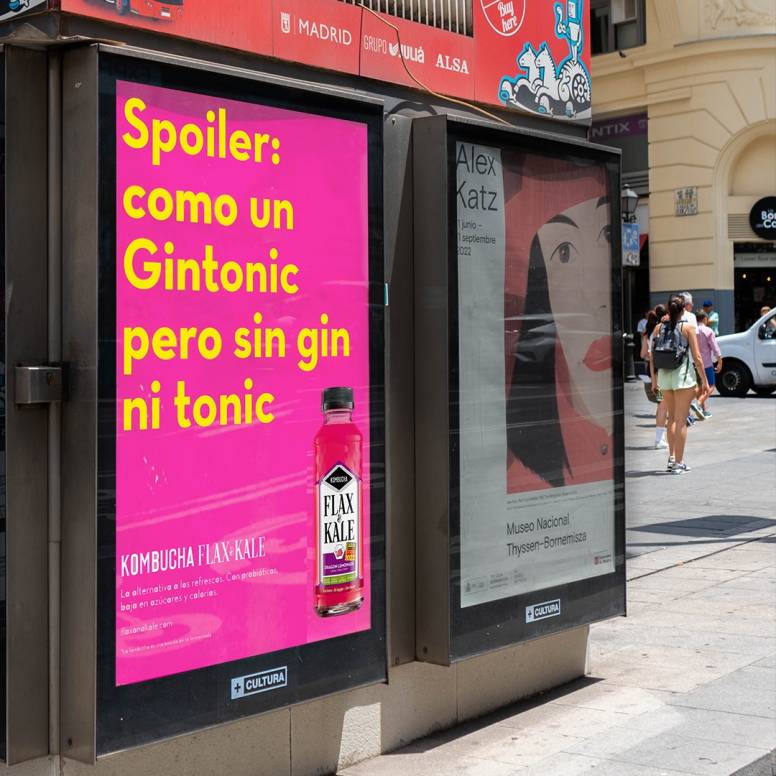 La campaña posiciona la kombucha Flax & Kale como una alternativa saludable a los refrescos tradicionales, que contiene probióticos, está elaborada con zumos de frutas cold-pressed 100% naturales, y es baja en azúcares y calorías. La campaña, de alcance nacional, acaba de dar el pistoletazo de salida y contará con un gran despliegue hasta finales de agosto para hacer spoiler por todas partes. Se emitirá en las principales cadenas de televisión nacionales de Mediaset, Atresmedia y también en TV3, aparecerá en las cabeceras lifestyle más relevantes como Yorokobu y Vogue, en los principales medios generalistas como La Vanguardia o el País o haciendo patrocinios en formatos televisivos en formatos como El Hormiguero. Además, hará spoiler con activaciones en punto de venta y en el transporte público y OHH -estaciones de metro, bus, tranvía y quioscos- de Barcelona, Madrid, A Coruña y Bilbao lanzando diferentes mensajes, entre ellos “Spoiler: tenemos zero tonterías”, “Spoiler: es perfecta en cualquier momento”, “Spoiler: vivirás este verano kombuchamente” o “Spoiler: estamos más buenas que tu último superlike”.