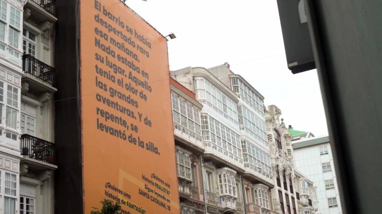 A través de 13 soportes exteriores y hasta el 1 de noviembre, la compañía viste de literatura el corazón de la ciudad gallega. ¿El objetivo? Que la ciudadanía se anime y siga leyendo. ¿Cómo? Posibilitando que cada cual, caminando por las calles coruñesas, decida cómo avanza la historia. Una gran lona de 135 metros cuadrados emplazada en la Praza de Lugo inicia el juego narrando el comienzo de la aventura: “El barrio se había despertado raro esa mañana. Nada estaba en su lugar. Aquello tenía el olor de las grandes aventuras. Y, de repente, se levantó de la silla.”