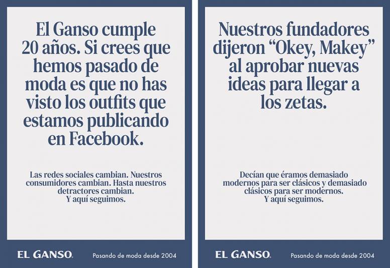 El Ganso celebra su vigésimo aniversario con una campaña publicitaria en la que aboga por el humor y la autocrítica sana. Con ‘Pasando de moda desde 2004’,, activa desde finales de abril, la marca española se ríe de sí misma haciendo referencia a su clasicismo atemporal. Frases como «Decían que éramos demasiado modernos para ser clásicos y demasiado clásicos para ser modernos. Y aquí seguimos», «El Ganso cumple 20 años. Si crees que hemos pasado de moda es que no has visto los outfits que estamos publicando en Facebook» o «Nuestros fundadores dijeron ‘¡Okey, Makey¡’ al aprobar nuevas ideas para llegar a los zetas» aparecerán en las creatividades que celebran las dos décadas de vida de esta compañía, y se materializarán en posts en redes sociales, a través de lonas en las principales tiendas de El Ganso en España y en publicidad exterior móvil en Madrid capital.