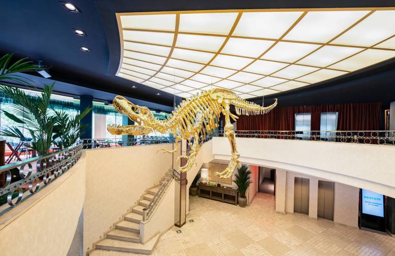 Hesperia Hoteles continúa con su apuesta por un turismo ‘hesperiencial’ en el que se pone en el centro la cultura local y se promueven experiencias únicas, tanto para viajeros como para público local. Ahora, la cadena presenta su tercer hotel renovado, el Hesperia Presidente, ubicado en la avenida Diagonal de Barcelona. Un espacio que desafía las expectativas desde el primer momento, con su impactante anfitrión, Trixie, un imponente T-Rex dorado colgando del techo, que rompe con la estética clásica de los años 20 que define su diseño interior.