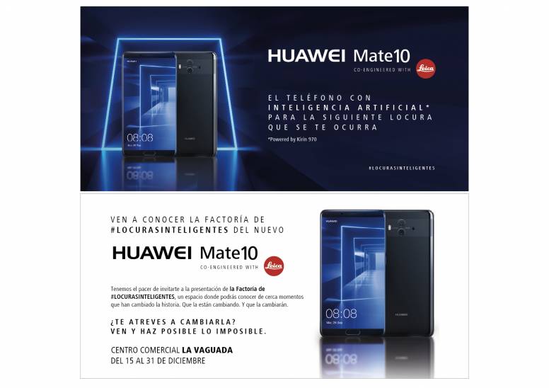La marca china Huawei ha puesto en marcha en España la campaña "Locuras inteligentes" para promocionar su modelo Huawei Mate10 y evangelizar entre la población general, al mismo tiempo, sobre las ventajas de la inteligencia artificial aplicada al mundo de la telefonía móvil. La firma se ha decantado por una experiencia inmersiva y experiencial para conseguir este objetivo, gracias al espacio La Factoría de Ideas Inteligentes, que estará operativo del 15 al 31 de diciembre en el C.C La Vaguada. Un multiespacio tecnológico que albergará las principales innovaciones de Huawei Mate10 y que dará la oportunidad al público de registrar sus ideas más innovadoras y hacerse con una unidad del dispositivo.
