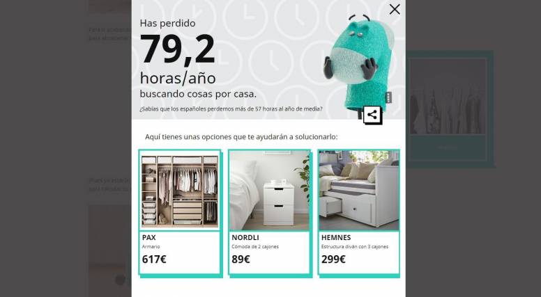 Söckbot es el entrañable calcetín que da vida al chatbot, quien ofrece los cálculos de forma personalizada y recomienda tres soluciones de Ikea para ayudar con el desorden. Cada una de ellas te ahorra ‘x’ horas al año.