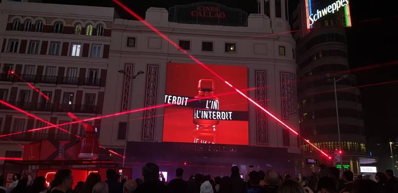 Espectáculo de luz y sonido en el centro de Madrid. Con motivo del lanzamiento de la nueva fragancia femenina L'Interdit Rouge Ultime, Givenchy ha realizado una llamativa acción especial en la madrileña plaza del Callao que atrajo las miradas del público que transitaba por la zona. Un show de rayos láser y música electrónica, combinado con la retransmisión sincronizada de un vídeo en las pantallas exteriores de los Cines Callao y de El Corte Inglés, que sirvió de preámbulo a la emisión del spot de la nueva fragancia.