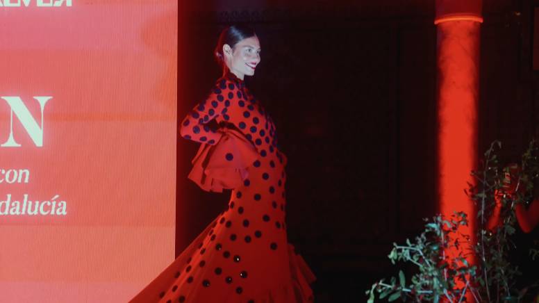 La marca ha presentado un traje de flamenca interactivo que homenajea el origen andaluz de Lanjarón y permite accede a trescientos relatos personales que resaltan la herencia de la prenda