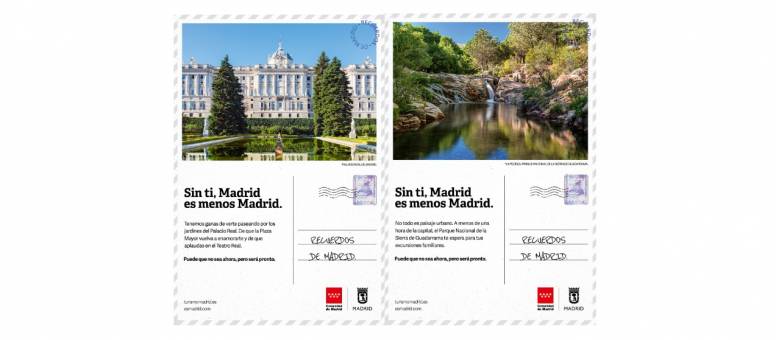 Uno de los rasgos característicos de la campaña es su materialización gráfica en formatos online y offline a través de las tradicionales postales de correos, con seis diferentes diseños que ilustran algunos de los activos turísticos más icónicos y representativos de la ciudad y la Comunidad, poniendo en valor su oferta gastronómica, cultural y también sus impresionantes entornos naturales. Estas emotivas piezas pretenden evocar un mensaje personal y cercano a quienes las contemplen, convirtiendo a estas personas en remitentes directos del mensaje de Madrid. La ciudad te espera porque "Sin ti, Madrid es menos Madrid".