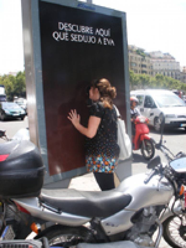 En las marquesinas aparece el ojo de una cerradura de grandes dimensiones acompañado del lema “Descubre aquí que sedujo a Eva”. Si nos dejamos llevar por la tentación y miramos dentro de la cerradura, mientras esperamos el autobús, podemos ver el nuevo spot del verano de Magnum que la actriz protagoniza.