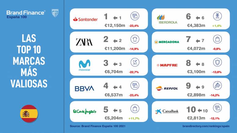 Siete nuevas marcas entran en el ranking de marcas mas valiosas de España que baja de valor por tercer año consecutivo, el ranking que analiza anualmente las 100 marcas nacionales más valiosas, España 100 2021 de Brand Finance. El ranking lo lidera de nuevo Banco Santander como la marca española más valiosa del mundo con un valor de marca de 12.150 millones de euros y destaca el aumento de valor de Día (+55.9%) como la marca con mayor aumento de valor de las solo 17 que incrementan su valor.