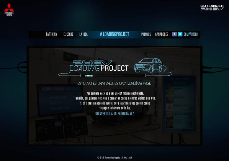 Dentro de su plan de acciones para la campaña de lanzamiento del Outlander PHEV, Mitsubishi ha lanzado una página web que recarga la batería eléctrica de este coche mediante la interacción de los usuarios. Es decir, que la marca ha creado el primer 4x4 híbrido enchufable del mercado y ha propiciado una acción online (#loadingproject) con la que el modelo se recarga con las visitas y tuits de los usuarios.