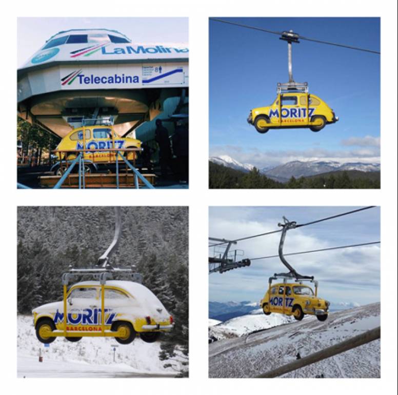 El grupo cervecero Moritz ha colocado un Seat 600 como uno de los telecabinas de la estación de esquí de La Molina. La elaboración del proyecto ha corrido a cargo de la agencia de publicidad Pavlov.